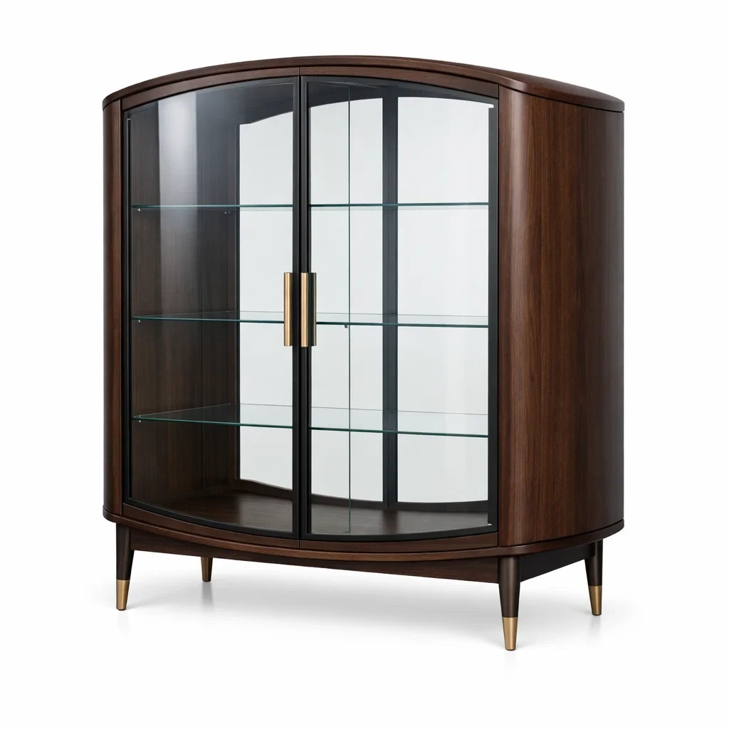 Vitrine courbe en bois avec portes vitrées et étagères en verre