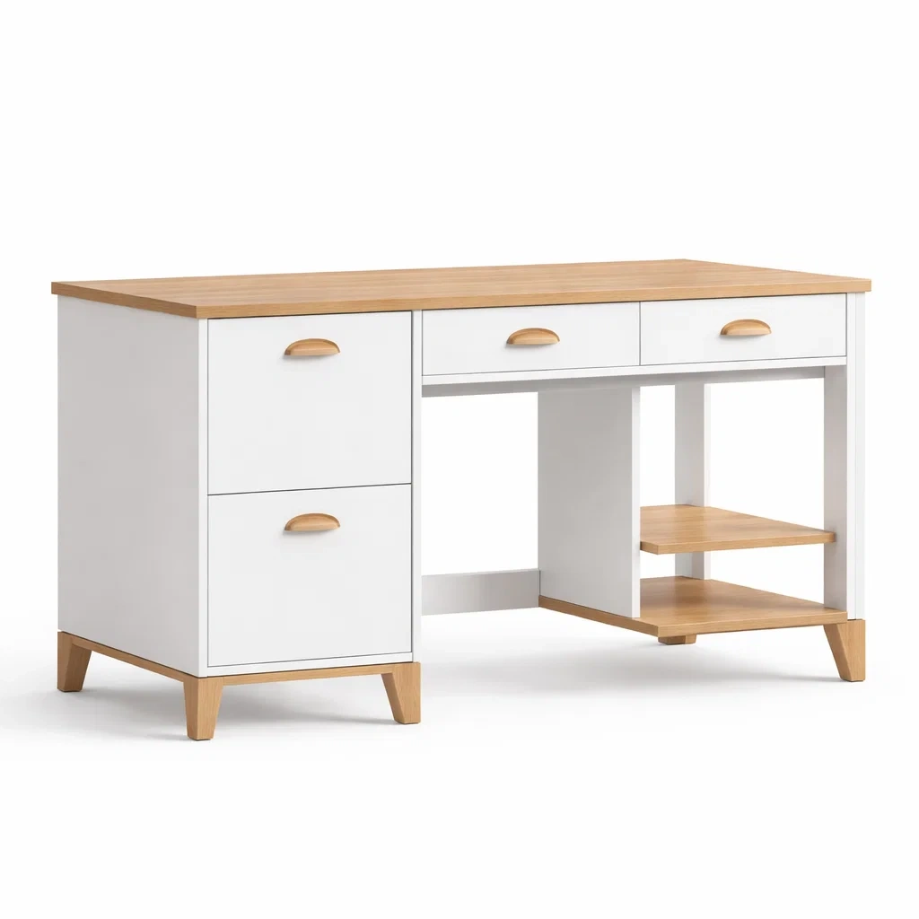 Ce bureau est fabriqué en MDF avec un placage de chêne pour le plateau et les détails. Il comprend trois tiroirs spacieux et deux étagères ouvertes pour un rangement pratique. Ses dimensions sont de 140 cm de longueur, 60 cm de largeur et 75 cm de hauteur. Le bureau a une capacité de charge maximale de 50 kg.