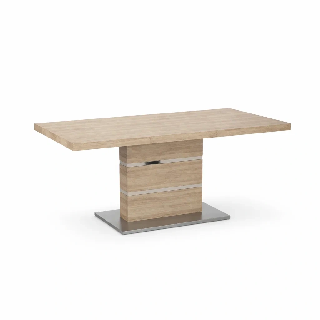 Matériau : Bois avec placage effet chêne, base en acier inoxydable.