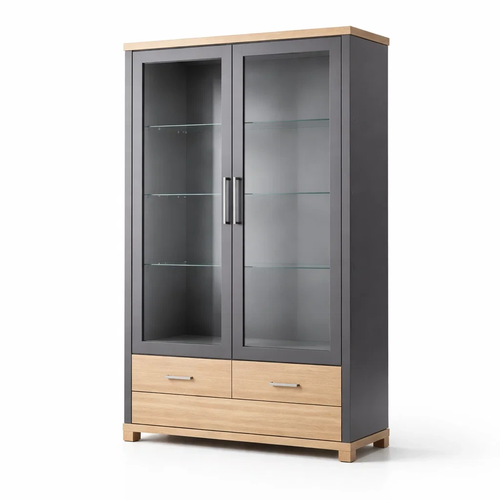 Vitrine en bois et verre trempé gris et chêne