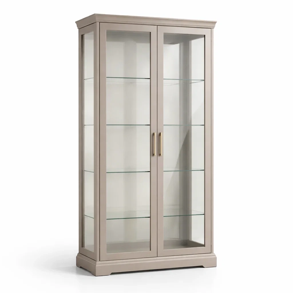 Cette vitrine dispose d'une structure en bois avec des portes en verre trempé de 5 mm d'épaisseur. Elle est dotée de 4 étagères en verre trempé, chacune pouvant supporter jusqu'à 10 kg. Les dimensions sont de 180 cm de hauteur, 80 cm de largeur et 35 cm de profondeur. La couleur de la structure est Taupe. Le design comprend des portes à double battant sans serrure, et des étagères fixes. Pour l'entretien, il est conseillé de nettoyer avec un chiffon doux et sec.